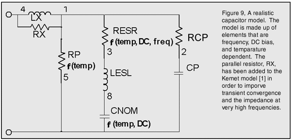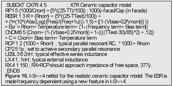 While it is common to represent a capacitor with a series R (ESR), L (ESL), and C (nominal capacitance) combination, a more realistic subcircuit representation of a ceramic capacitor is shown in Figure 9 [1].
