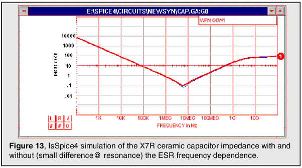 [1] provides further derivation of, and reasoning behind, the equations in Figure 10. It also provides equations for NP0, C0G, and Y5V capacitor families. SPICE models were not provided in [1] due to syntactical issues. The new ISSPICE4 B element alleviates these roadblocks. Several models for the X7R, C0G, and NP0 families of capacitors are available on the Intusoft Web site with the complete SPICE offering on the newsletter subscribers disk. In the next Intusoft Newsletter we will derive a realistic model for a tantalum capacitor.