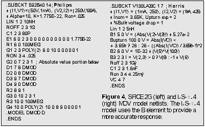 The SPICE2G and ISSPICE4 subcircuits are shown in Figure 4. A cascade of 2 sources is used in order to avoid problems with large K values. The subcircuit implements the following relationship: I = V(6) = K2(K1V)a = 1e-32 * K1Va with V(5) = |V(2,3)| * K1. The absolute value elements in SPICE 2 are replaced with the Abs function in B1. B3 keeps the current flowing in the proper direction. The model in [3] does not account for the upturn region at high voltages. It uses a constant value for a. This deficiency is corrected with the ISSPICE4 If-Then-Else expression feature. The output node, V(100), in the Bupturn statement in Figure 4, generates the nonlinear a value. When the current in the MOV reaches 3650A, a is reduced from its value of 26, thus causing the curve to bend upward. Roff and Ron represent the leakage and bulk resistance, respectively.